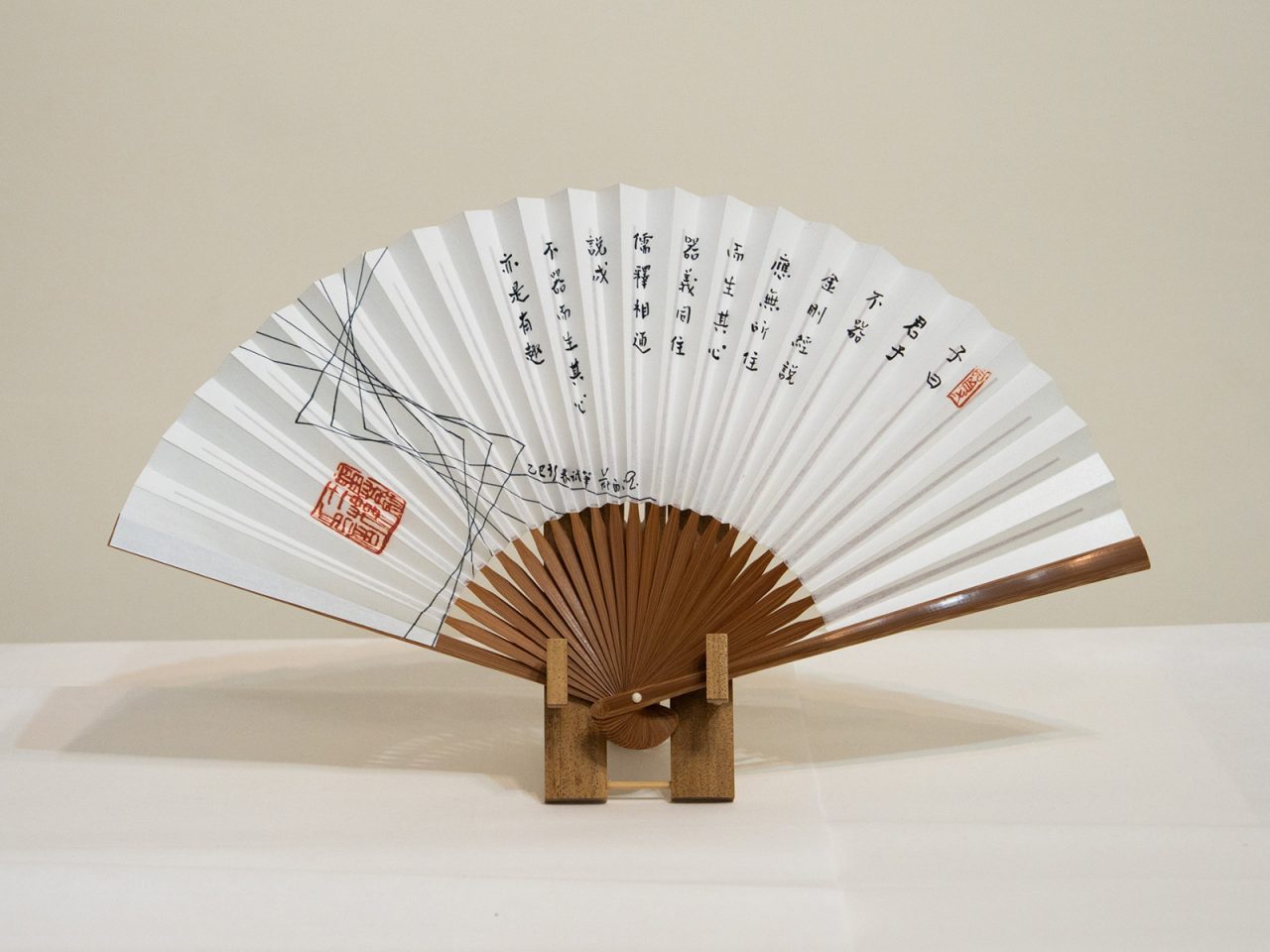 「器」和「住」,二者是相似概念,也就是「解放自我」,不受想像的拘束,所以把兩位哲人的話兜在一起,把孔子的「不器」串在釋迦牟尼的「而生其心」,成了「不器而生其心」,就是「自我解放,想像無限」;漢代傳入佛法,被認為來自西方或西天,所以孔子和佛陀理念的碰撞就是東西方智慧的火花。扇面文案: