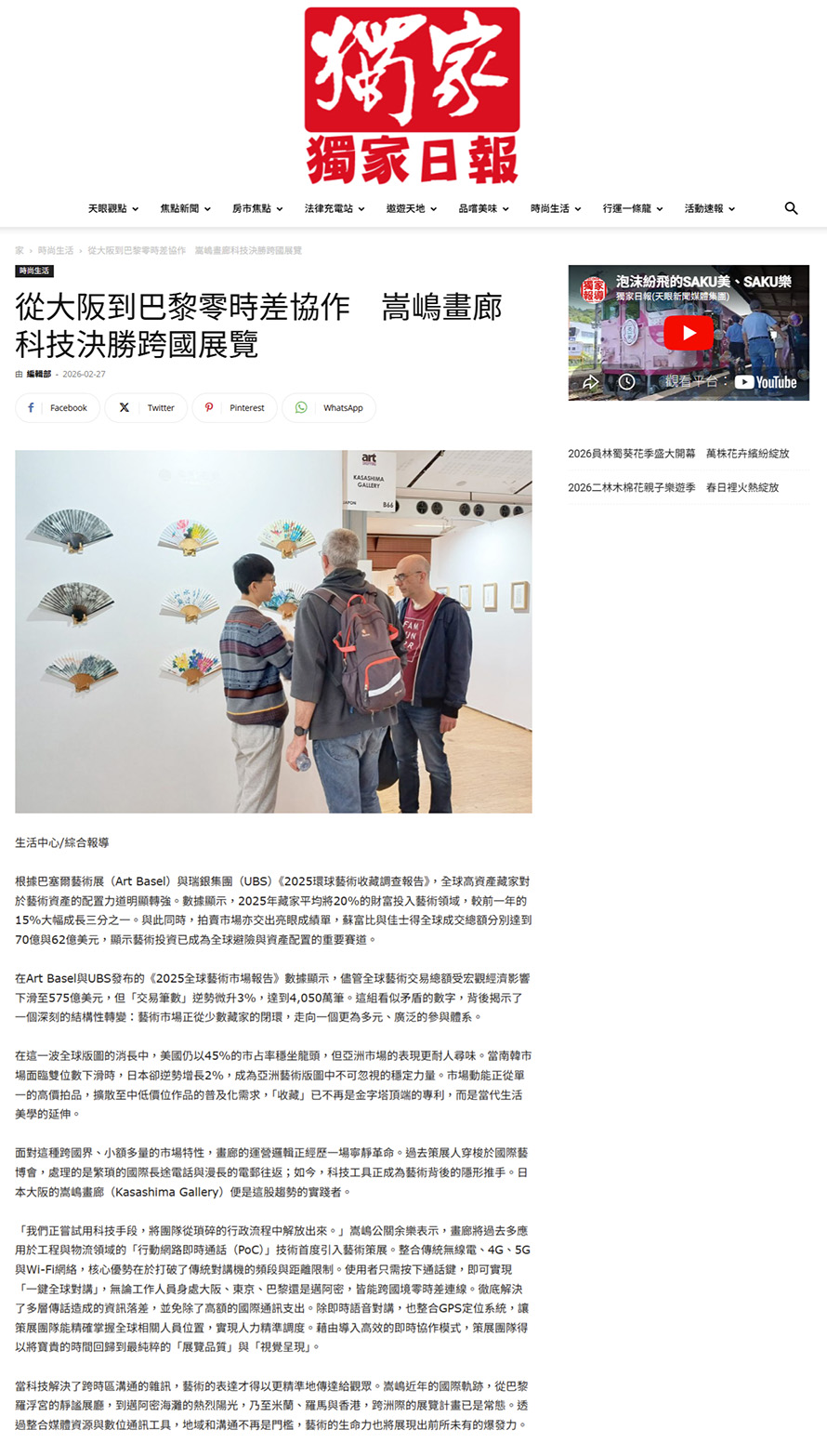 面對這種跨國界、小額多量的市場特性,畫廊的運營邏輯正經歷一場寧靜革命。過去策展人穿梭於國際藝博會,處理的是繁瑣的國際長途電話與漫長的電郵往返;如今,科技工具正成為藝術背後的隱形推手。日本大阪的嵩嶋畫廊(Kasashima Gallery)便是這股趨勢的實踐者。